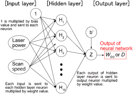 To determine the heat input area dimensions and under the process parameters in and near the defect-free area, a neural network was constructed to predict and from the laser power and scan speed. The neural network used was a three-layer feed-forward fully coupled neural network comprising an input layer, a hidden layer, and an output layer, as shown in Figure 9, with 10 neurons in the hidden layer. For training the neural network, that is, optimization of the weight and bias values in Figure 9, and under the condition that balling does not occur, as obtained from the single-track test, were used as training data.