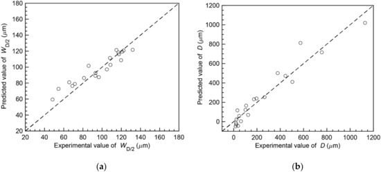 Comparison between experimental melt pool dimensions and results predicted by the neural network: (a) melt pool width at half melt pool depth ; (b) melt pool depth .
