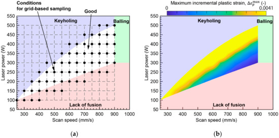 For grid-based sampling, as shown in Figure 11a, the good track region and its neighborhood in the laser power-scan speed map were divided into grids at laser power increments of 50 W and scan speed increments of 50 mm/s. The maximum incremental plastic strain in the melt pool was obtained by thermal elastoplastic analysis, as described in Section 2.2.1.