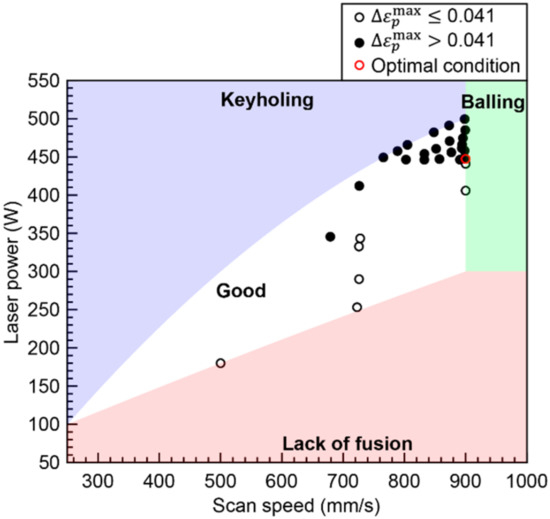 Figure 11b shows the distribution of the maximum incremental plastic strain in the good track region in the laser power-scan speed map obtained by interpolating the maximum incremental plastic strain under each condition in the grid-based sampling. The region above the solidification crack occurrence threshold (=0.0041) is indicated by a single color. This result indicates that solidification cracks may occur even within the good track region, which was obtained from the viewpoint of no defect generation. The process parameters that do not cause defects and solidification cracks should be selected within the good track region and within the region where the maximum incremental plastic strain in the melt pool is <0.0041. The maximum incremental plastic strain tends to increase at a high laser power or low scan speed, which is the same trend as reported in the previous study. From the results, it can be estimated that the most efficient condition, i.e., the condition with the highest laser power, is the optimal condition: a laser power of 440 W and a scanning speed of 900 mm/s.