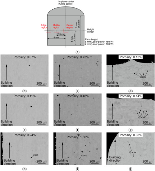 As shown in Figure 13a, cross-sectional observations were made in three regions: the center of the plane (circular center), the middle of the edge and the center of the plane, and the region including the edge. Figure 13b to j show the results of cross-sectional observation in each regions of the parts made by both conditions. Each image also shows the porosity ratio calculated by using the black area as porosity. When cracks were observed, the typical crack positions were indicated by arrows.