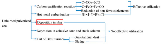 - When the content of UPC is in the range of approximately 0.5–1 wt%, the UPC reduces the effect of the temperature on the slag viscosity. When the content of UPC is in the range of approximately 2–4 wt%, the thermal stability of the slag begins to deteriorate, and the UPC has a negative effect on the slag viscosity. To decrease the content of UPC in BF slag to 2 wt%, it is necessary to increase the burnout rate of pulverized coal to 85%.