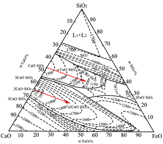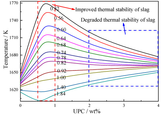 - When the content of UPC in the slag is less than 0.8 wt%, the slag viscosity, free-running temperature and viscous flow activation energy decrease. This is due to the breakdown of the complex spatial network structure of SixOz− y in the slag and the formation of a series of complex compounds with low melting points. Thus, the low content of UPC has the function of diluting the slag to some extent.