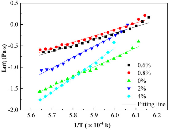 | UPC Contents | Fitting Line | Eη (kJ/mol) | B0/(N·s·m−2) | R2 |