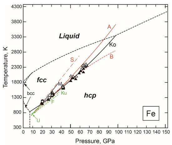 More recently, Anzellini et al. [15] also determined the fcc-hcp transition boundary as part of their determination of the melting points of Fe to 200 GPa in laser-heated DAC. Their data show slightly higher, but still consistent, transition temperatures with Komabayashi et al.’s [14] data (Figure 1).