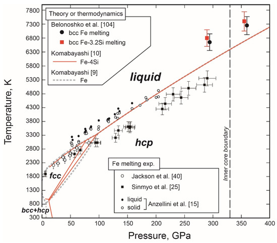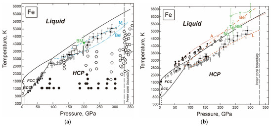 The stable iron structure in the inner core has been a literally “central” issue about the Earth as its physical properties, such as the melting/crystallising point and element partitioning upon crystallization, control core dynamics. Furthermore, the constituent phase structure would govern inner core dynamics, for example, the seismic anisotropy observed there, namely, seismic waves travel faster along the Earth’s polar axis by 3–4% compared with equatorial directions [19,20,21,22], which will not be discussed in this paper as the focus is on the phase relations.