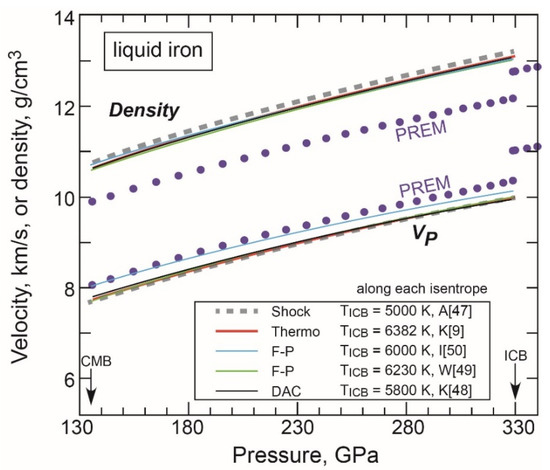 The longitudinal wave velocity (Vp) and density of iron liquid calculated from the thermodynamic model [9] are compared with those from shock wave experiments [47], DAC experiments [48], and first-principles calculations [49,50], together with seismological models (preliminary reference Earth model (PREM), Dziewonski and Anderson [51]) over the outer core depths between the core-mantle boundary (CMB) and ICB (Figure 3). The different types of measurements, except those by [50], show consistent Vp and density of iron liquid. The validity of the EoS for liquid iron in [9] was further confirmed by the first-principles calculation to 2 terapascals and 10,000 K [49]. As such, the Fe database of Komabayashi [9] based on static experimental data is consistent with shock compression studies and theoretical studies in phase relation and EoS of the phases. If one models the EoS for liquid iron using Sinmyo et al.’s [25] melting curve, its resulting density will be greater than the case of Komabayashi’s [9] melting curve, which will have to be tested by comparing with those different types of measurements in the future.