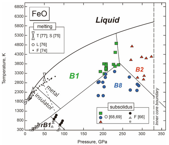 FeO shows rich polymorphism from 1 bar to core P-T conditions including magnetic and metal-insulator transitions [62,63,64,65,66,67,68,69,70]. A metallic B8 structure was previously considered to be relevant to Earth’s core due to an inferred strongly pressure-dependent phase boundary between B1 and B8 phases at about 70 GPa [63,65,66,71]. However, the slope of the boundary turned out to be less pressure-dependent [68] and the B8 phase was found to transition to a B2 phase under Earth’s core P-T conditions [69]. On the other hand, the B1 phase is stable as a liquidus phase over a wide P-T range. This phase was considered to be insulating, but Fischer et al. [72] and Ohta et al. [70] demonstrated from either experiment, theory, or in combination, that it undergoes an insulator-metal transition at 30–90 GPa depending on temperature (Figure 5).