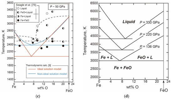 As for the eutectic temperature, Komabayashi [9] discussed that the nonideal mixing model reproduced DAC experimental data to 50 GPa and the ideal mixing model worked for the data of [69] to pressures above 200 GPa (Figure 9). Recent laser-heated DAC data [85,86] are also consistent with the ideal mixing model. This agreement between the thermodynamic calculations and experiments indicates that the mixing property indeed changes from the highly nonideal at low pressures to ideal under core pressures. The calculated eutectic compositions at the core pressures are slightly depleted in oxygen than the experimental measurements (Figure 7). This could be resolved if the melting points of FeO would be elevated, which can be tested in the future.