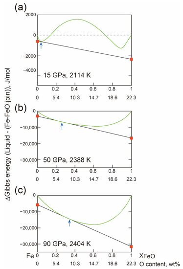 I here calculated a G-X relation for liquids and solids in the Fe-FeO system from the thermodynamic database [9,82] (Figure 8) to make detailed analyses of the increasing oxygen content in eutectic melt with increasing pressure. At a low pressure of 15 GPa, the nonideal mixing of Fe and FeO liquids forms two minima in the free energy curve, which accounts for the liquid immiscibility for intermediate bulk compositions. The eutectic point where solid fcc Fe and liquid coexist is very close to Fe (Figure 8, upper panel). With increasing pressure, the pressure effect stabilizes the liquids in the intermediate compositional range, and therefore the free energy curve becomes a simple downward convex curve where the two-liquid field diminishes (<50 GPa) while the eutectic point is moving towards the FeO side (Figure 8, middle panel). At a greater pressure of 90 GPa, the eutectic point is at about 9 wt% O (Figure 8, lower panel) and there is no further move with further increasing pressure because there is no longer drastic change in the shape of the free energy curve.