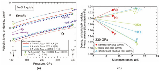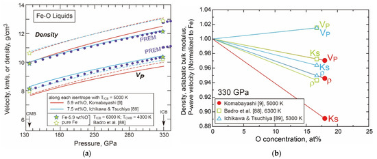The Vp and density of Fe-FeO liquids were calculated from the thermodynamic model [9]. The results are shown in Figure 10 together with first-principles calculations [88,89]. The calculated results by [9] show that the addition of oxygen to Fe liquid reduces both the density and Vp, while the theoretical calculations show a reduction in density but an increase in Vp. Figure 10b shows the effects of oxygen on the liquid iron properties: density, adiabatic bulk modulus (Ks), and Vp. Komabayashi’s [9] model predicted a negative effect (i.e., decrease) on the velocity by the addition of oxygen, while the first-principles calculations by Badro et al. [88] and Ichikawa and Tsuchiya [89] predicted positive effects (Figure 10b). However, this does not necessarily imply that the experiment-based and theory-based results are complete opposites. The result depends on the magnitude of reduction of the bulk modulus of iron liquid due to oxygen. All of [9,88,89] show that the addition of oxygen reduces both the bulk modulus and density (Figure 10b). The Vp of iron liquid is reduced in Komabayashi [9] because the bulk modulus decreases more than the density by mixing an oxygen component. As such, the Vp may increase or decrease due to oxygen depending on the difference in the bulk modulus between the end-members (i.e., Fe and FeO in [9]). In his modelling of the EoS of liquid phases, Komabayashi [9] demonstrated that the compressibility of a liquid should be close to that of the counterpart crystalline phase under core pressure, and the small bulk modulus of liquid FeO was a consequence of the small bulk modulus of solid B1 FeO. The EoS of solid B1 FeO was established based on experimental data to 207 GPa and 3800 K [69,73] which are relevant to core conditions and therefore its elastic behaviour can be reliably applied. Komabayashi [9] listed a set of EoS for the solids and liquids in the Fe-O system while the first-principles calculations did not provide such a self-consistent set of EoS for the solids and liquids. Further comparison is needed to resolve the difference between experiment and theory.