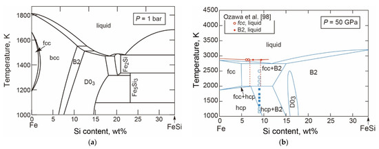 - Asanuma, H.; Ohtani, E.; Sakai, T.; Terasaki, H.; Kamada, S.; Hirao, N.; Sata, N.; Ohishi, Y. Phase relations of Fe-Si alloy up to core conditions: Implications for the Earth inner core. Geophys. Res. Lett. 2008, 35. [Google Scholar] [CrossRef]