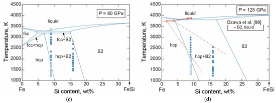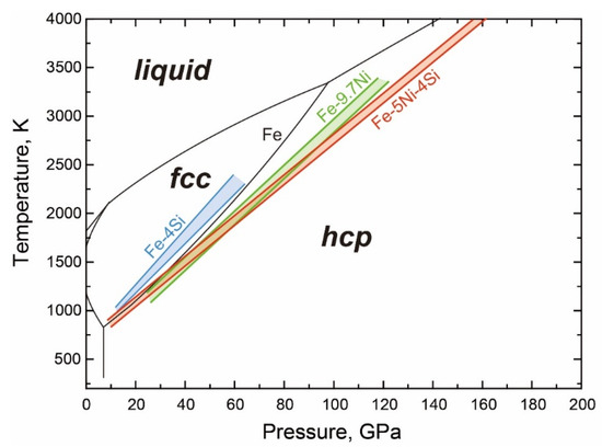 The melting points of the fcc and hcp phases in Fe-10Ni were measured to 125 GPa using laser-heated DAC and synchrotron Mössbauer spectroscopy by Zhang et al. [60], which was the same methodology as in [40] for pure Fe (Figure 4b). The results indicate that the addition of Ni negligibly changes the melting points of the fcc phase. However, the triple point where the hcp, fcc, and liquid phases are stable is moved to a higher pressure by the addition of Ni because of the steeper dP/dT slope of the fcc-hcp transition boundary [57], which results in a depression of the melting point of the hcp phase by about 200 K for Fe-10Ni (Figure 4b). Similar discussions were recently made by Torchio et al. [61] from their new experimental measurements of melting point in more Ni-enriched systems to Fe-36Ni. As discussed later in the Fe-Ni-Si system, Ni-bearing systems may be more complicated than expected from relevant binary systems.