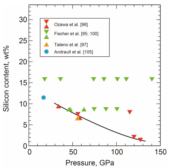 - Andrault, D.; Bolfan-Casanova, N.; Ohtaka, O.; Fukui, H.; Arima, H.; Fialin, M.; Funakoshi, K. Melting diagrams of Fe-rich alloys determined from synchrotron in situ measurements in the 15–23 GPa pressure range. Phys. Earth Planet. Inter. 2009, 174, 181–191. [Google Scholar] [CrossRef]