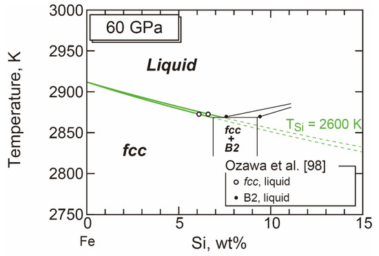 Newly improved static experimental measurements were reported by Anzellini et al. [15] in which melting was detected by the presence of diffuse scatterings from Fe liquid in laser-heated DAC. The previous melting experiments were based on the loss of diffractions lines from solids [12] or the detection of movement on the sample surface [13] as melting criteria. The results of [15] are well consistent with the shock wave and first-principles calculations, and the melting point of Fe at the ICB pressure should be 6230 ± 500 K [15]. Since the report by [15], the presence of a diffuse scattering has become a standard criterion for melting in the experimental mineral physics community. Published in the same year, Jackson et al. [40] also determined the melting points of fcc iron under pressure to 82 GPa using synchrotron Mössbauer spectroscopy which enabled them to monitor the dynamics of the iron atoms (Figure 2b). Their data showed somewhat lower melting temperatures than those of [15], but consistent with earlier [12,13] and recent measurements [25]. On the other hand, Morard et al. [41] discussed that Jackson et al.’s [40] data can be consistent with Anzellini et al.’s [15] when their pressure values were recalculated with revised thermal pressure values. As discussed later, the data of Jackson et al. [40] can be integrated into a thermodynamic model which is consistent with multi-anvil phase equilibrium data in the Fe-O system.