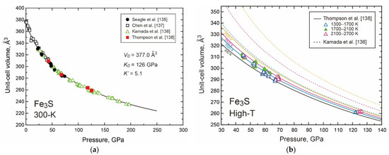 - Seagle, C.T.; Campbell, A.J.; Heinz, D.L.; Shen, G.; Prakapenka, V.B. Thermal equation of state of Fe3S and implications for sulfur in Earth’s core. J. Geophys. Res. Space Phys. 2006, 111. [Google Scholar] [CrossRef]