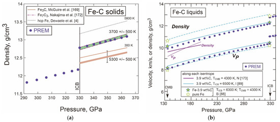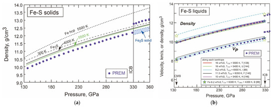 Figure 3 shows that liquid iron shows a greater density by 7.1% and a reduced velocity by 3.7% compared with the PREM at the ICB conditions [9]. Similarly, the solid hcp Fe shows 4.5% greater density than the inner core. These values, so-called core density deficit (cdd), are the important starting point for the discussions of the kinds and amounts of light elements dissolved in the core. The cdd of the inner core has often been revised upon publication of a new EoS for the hcp phase and the most recent estimate is based on Fei et al. [52] of 3.6% at 6000 K. The cdd obviously depends on core temperature which can be constrained by the melting point at the ICB. The densities of iron liquid and solid, and the melting point of iron at the ICB can only be simultaneously constrained by internally consistent thermodynamic models (e.g., [9]).