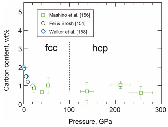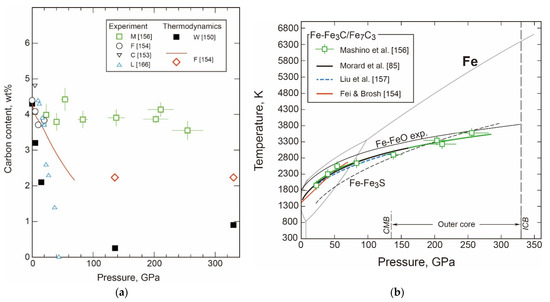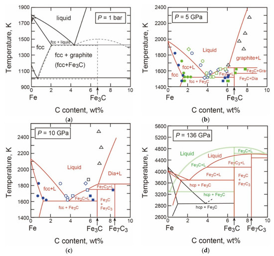 - Fei, Y.W.; Brosh, E. Experimental study and thermodynamic calculations of phase relations in the Fe-C system at high pressure. Earth Planet. Sci. Lett. 2014, 408, 155–162. [Google Scholar] [CrossRef]