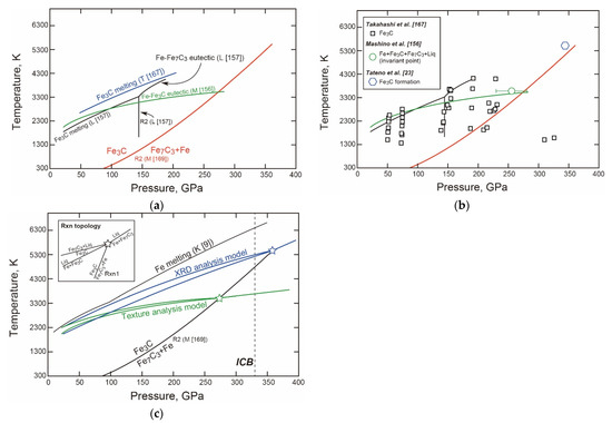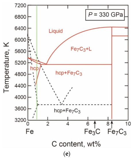 - Liu, J.; Lin, J.F.; Prakapenka, V.B.; Prescher, C.; Yoshino, T. Phase relations of Fe3C and Fe7C3 up to 185 GPa and 5200 K: Implication for the stability of iron carbide in the Earth’s core. Geophys. Res. Lett. 2016, 43, 12415–12422. [Google Scholar]