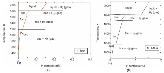 - Fukai, Y.; Mori, K.; Shinomiya, H. The phase diagram and superabundant vacancy formation in Fe-H alloys under high hydrogen pressures. J. Alloys Compd. 2003, 348, 105–109. [Google Scholar] [CrossRef]