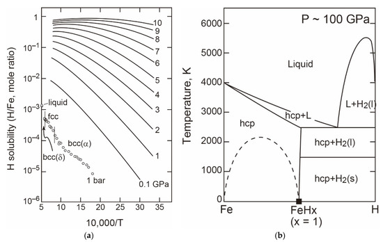 - Fukai, Y. Some properties of the Fe-H system at high pressures and temperatures, and their implications for the Earth’s core. In High-Pressure Research: Application to Earth and Planetary Sciences; Syono, Y., Manghnani, M.H., Eds.; AGU: Washington, DC, USA, 1992; pp. 373–385. [Google Scholar]