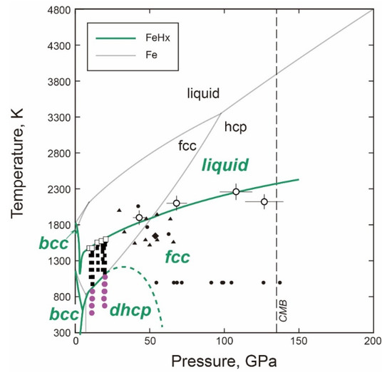 - Narygina, O.; Dubrovinsky, L.S.; McCammon, C.A.; Kurnosov, A.; Kantor, I.Y.; Prakapenka, V.B.; Dubrovinskaia, N.A. X-ray diffraction and Mossbauer spectroscopy study of fcc iron hydride FeH at high pressures and implications for the composition of the Earth’s core. Earth Planet. Sci. Lett. 2011, 307, 409–414. [Google Scholar] [CrossRef]
