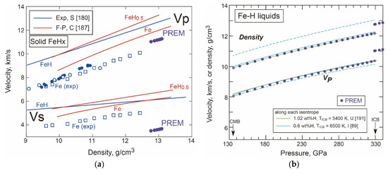 The above analyses suggest that Fe-O liquids may or may not account for the outer core profiles (Figure 10a). On the other hand, hcp iron may crystallise to form the inner core, if the outer core contains 5.9–7.5 wt% oxygen [88,89] since the oxygen content in eutectic melt would be greater (Figure 7). The crystallised hcp iron would however not accommodate any amount of oxygen [68] so that it cannot account for the inner core density deficit. Therefore, the addition of oxygen alone to iron cannot fully explain the PREM profiles of the core.