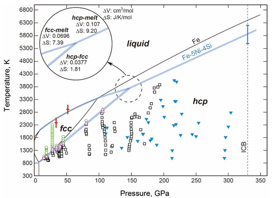 Phase relations of the Fe-Ni system are reviewed here. In particular (i) the fcc-hcp transition boundary, (ii) the stable structure in the inner core, and (iii) the melting point at the ICB, are discussed in comparison with the cases of pure Fe (Section 3.1.1). The Ni content in Earth’s core is expected to be 5–15 wt% from the cosmochemical arguments (see [53]) and therefore many of the existing reports were made on the Fe-rich portion, namely Fe-5-15Ni.