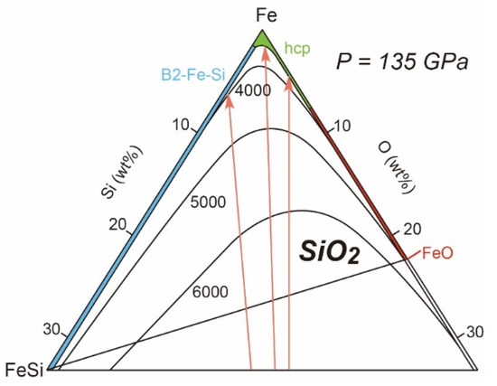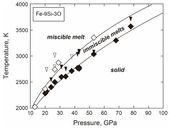 - Arveson, S.M.; Deng, J.; Karki, B.B.; Lee, K.K.M. Evidence for Fe-Si-O liquid immiscibility at deep Earth pressures. Proc. Natl. Acad. Sci. USA 2019, 116, 10238–10243. [Google Scholar] [CrossRef] [PubMed]
