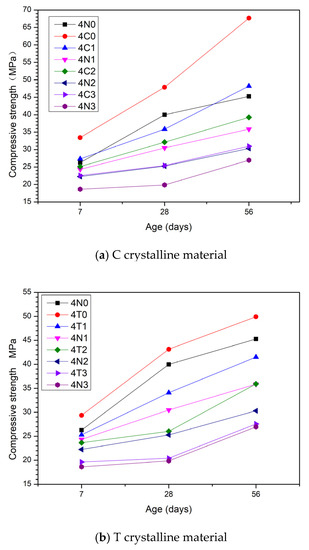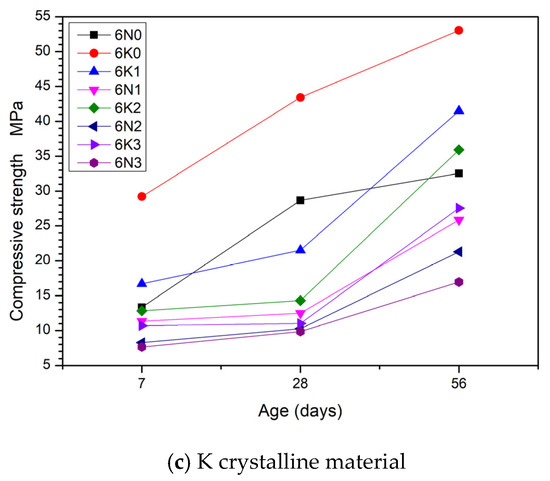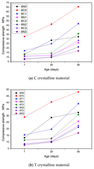 Figure 3. When the water–binder ratio was low, C was used as a coating material and recycled fine material was used to replace 0%. The strength of 7 days, 28 days, and 56 days is 24.83%, 32.89%, and 41.99% higher than that of recycled fine material. The compressive strength was higher at a low water–binder ratio than at a high water–binder ratio for all the test groups. Moreover, the compactness was higher at a low water–binder ratio than at a high water–binder ratio. At the same water–binder ratio, material C had higher compressive strength than did the other materials for all curing ages. The initial compressive strength of material C was marginally greater than those of the other materials. For the same water–binder ratio and coating material, the effects of different proportions of recycled aggregate substitution on the compressive strength were compared. The highest compressive strength was obtained when material C was used as the coating material and the amount of replacement was 0%. Thus, the surface protection can be increased using C with 0% recycled substitution at a low water–binder ratio.