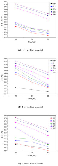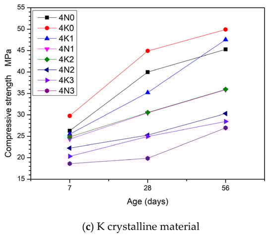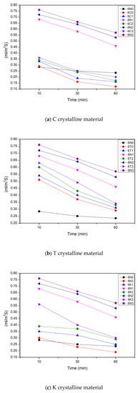 Figure 11. The surface water absorption was lower at a low water–binder ratio than at a high water–binder ratio, indicating that the number of capillary pores and the compactness were higher when the water–binder ratio was low. Under the same water–binder ratio, the surface water absorption of C was the lowest.