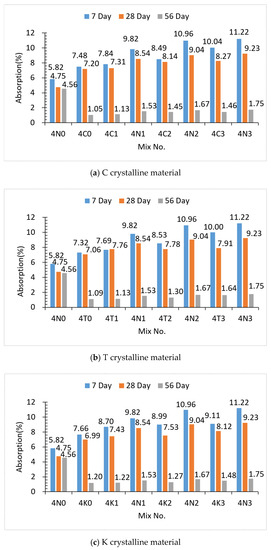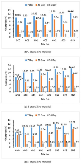 When the water–binder ratio was low, the 28-day water absorption of the samples coated with K, T, and C was 20.05%, 16.20%, and 11.06% lower than that of the uncoated samples, respectively. When the water–binder ratio was high, the 28-day water absorption of the uncoated samples was 56.67%, 47.23%, and 39.94% higher than that of the samples coated with K, T, and C, respectively. The aforementioned results indicate that the water absorption was lower at a high water–binder ratio than at a low water–binder ratio. Moreover, the water absorption of the samples coated with T was lower than that of the control group.