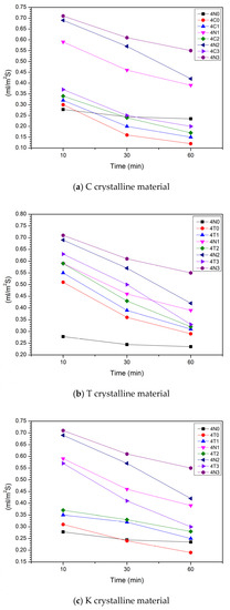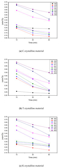 Figure 9, when the water–binder ratio was low, we used 20% recycled fine material and the detection time was 30 min. Under the aforementioned conditions, the surface water absorption of material C after 28 days was 47.62% and 90.48% lower than that of materials K and T coatings, respectively. When the water–binder ratio was high, we used 20% recycled fine material and the detection time was 30 min. Under the aforementioned conditions, the surface water absorption of material C after 28 days was 54.17% and 79.17% lower than that of materials K and T, respectively. Under both the high and low water–binder ratios, recycled fine aggregates could replace 20% of the natural aggregates. The surface water absorption was highest for material C, followed by materials K and T. Material C effectively reduced the surface water absorption of the specimens on which it was coated.