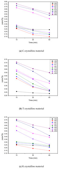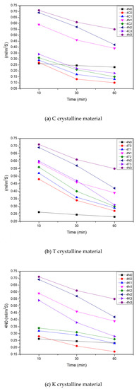 Figure 11, when the water–binder ratio was low, we used 20% recycled fine material, and the detection time was 30 min. Under the aforementioned conditions, the surface water absorption of material C after 56 days was 47.37% and 10.53% lower than that of materials K and T, respectively. When the water–binder ratio was high, we used 20% recycled fine material and the detection time was 30 min. Under the aforementioned conditions, the surface water absorption of material C coating after 56 days was 54.55% and 86.36% lower than that of materials K and T, respectively. Under both the high and low water–binder ratios, recycled aggregates could replace 20% of the natural aggregates. Surface water absorption was highest for material C, followed by materials K and T. Material C effectively reduced the surface water absorption of the samples coated with it.
