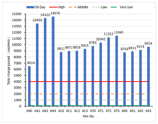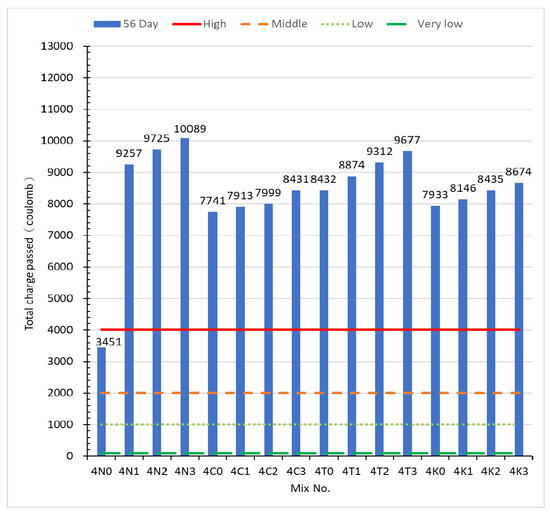According to the standard evaluation of chloride charge flux in the RCPT, cumulative charges of 4000, 2000–4000, 1000–2000, 100–1000, and <100 Coulombs indicate high chloride permeability, medium chloride permeability, low chloride permeability, extremely low chloride permeability, and chloride-free permeation, respectively. The results obtained in the RCPT at the water–binder ratios of 0.4 and 0.6 are displayed in