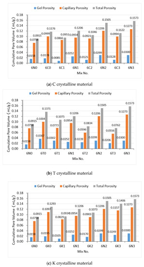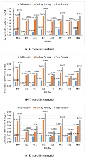 Figure 15, when the water–binder ratio was 0.4, recycled fine aggregates could replace 20% of the natural aggregates. The total pore volume of the material C was 36.08% and 86.87% higher than those of materials K and T, respectively. Compared with the uncoated samples, the total porosities of the samples coated with K, T, and C were 107.38%, 61.45%, and 32.56% lower, respectively. The total pore volume was highest for material K, followed by materials T and C. Material K effectively reduced the total porosity. When the water–binder ratio was 0.6, recycled fine aggregates could replace 20% of the natural aggregates. The total pore volume of material C was 2.59% and 81% lower than those of materials K and T, respectively. Compared with the uncoated samples, the total porosities of the samples coated with T, C, and K were 80.4%, 43.9%, and 40.27% lower, respectively. The total pore volume was largest for material T, followed by materials C and K. Material T effectively reduced the total porosity.