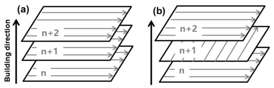 Schematic diagrams showing two different scanning strategies used in the present work: (a) single-directional scanning (SDS) and (b) cross-directional scanning (CDS).