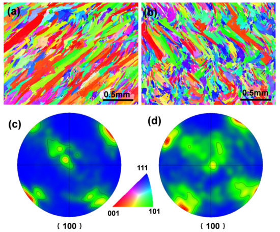 The (100) pole figures of longitudinal cross-sections of the SDS and CDS samples are shown in Figure 3c,d, respectively. It can be found that the SDS sample shows a typical fiber texture (Figure 3c), because only one of the <100> directions of columnar dendrites was oriented parallel to the heat flow direction. The (100) pole figure in Figure 3d shows the existence of a random cubic texture. The change of heat flow direction layer-by-layer caused by the CDS contributes to the alternately arranged grains and the formation of random texture in the CDS sample. In this situation, the continuously epitaxial growth is greatly suppressed.