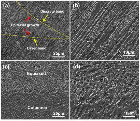 Figure 4 shows the SEM micrographs of as-fabricated samples under different scanning strategies. In accordance with the results shown Figure 2a, the SDS sample is dominated by columnar dendrites (Figure 4a). Figure 4a shows the SEM morphology at the layer interface of the SDS sample. The directly epitaxial growth of columnar dendrites is promoted between two adjacent layers under SDS. Figure 4b shows the SEM morphology at the discrete band. The highly ordered columnar dendrites directly grow epitaxially over the curved discrete band in an identical layer. Figure 4c shows the layer-boundary microstructure of the CDS sample. Similar to the OM results (Figure 2c), the microstructure of the longitudinal section and the cross section is dominated by columnar morphology and equiaxed morphology, respectively (Figure 4c,d). These results show that the epitaxial growth between two adjacent layers is suppressed under CDS.