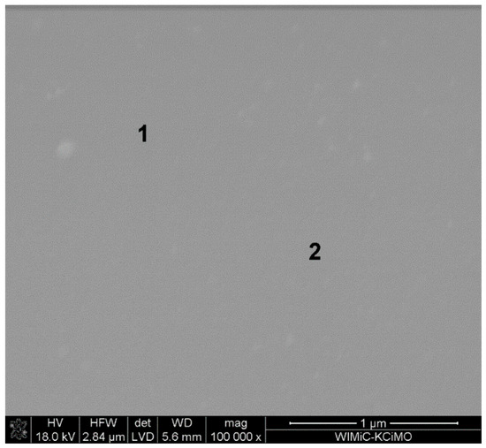 Surface morphology of the sample no. 1 (based on isopropanol-NaOH synthesis). Magnification 100,000×. Numbers indicate areas of EDX analysis.