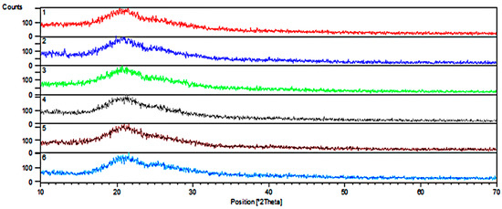 XRD study reveals that all samples are amorphous. However, Figure 3 shows XRD patterns with two broad peaks at the range 15−25 and 25−35 of 2θ, respectively, which may indicate that structure of gels consists of two sub-networks, i.e., inorganic and organic. Such effects are observed for glasses based on two glass formers, e.g., borosilicate glass [23].