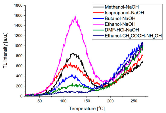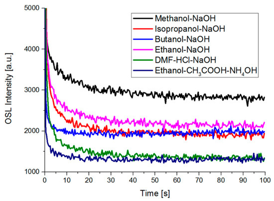 OSL of samples obtained by a two-stage process characterizes the lowest luminescence intensity that is similar to TL results (Figure 8). OSL signals for butanol and isopropanol solvents are not significantly different. It may result from the similar rate of degradation and thus the similar concentration of ZnPc in both cases. However, the highest intensity of OSL shows a sample with methanol solvent, where the final concentration of ZnPc is low (see Figure 4). It is the reverse effect compared to TL results.