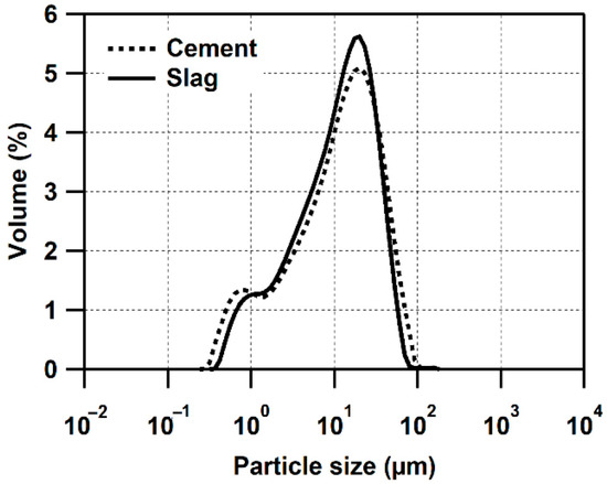 Ground granulated blast furnace slag of grade S95 from Huaxin Cement Co., Yichang, China, was used as precursor in this study. The chemical composition and particle size distribution are shown in Table 1 and Figure 1, respectively. The particle size distribution of slag was characterized by Malvern Mastersizer 2000 laser diffraction particle size analyser (Malvern Panalytical, Malvern, UK) through dispersing slag particles in water.
