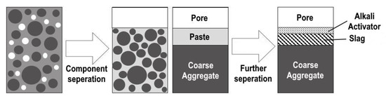 Alkali-activated materials are made of alkali-activators and aluminosilicate materials as precursors, which react to form Si–O–Al bonding in the materials [16,17,18,19,20]. The most common alkali activators include sodium hydroxide, sodium silicate, sodium sulphate and their potassium counterparts. The aluminosilicate precursors are usually natural minerals or industrial by-products, such as calcined clay, metakaolin, fly ash, bottom ash, slag and rice husk ash. Due to the industrial by-products’ nature as the precursors of alkali-activated materials, pervious concrete is usually treated as an eco-friendly construction materials that could potentially partially or even fully replace Portland cement in the future [21]. High early and late age strength, low creep and shrinkage and high sulphate resistance are the characteristic advantages of alkali-activated materials [20,22,23,24,25,26]. There are also disadvantages associated with the alkali-activated materials, such as efflorescence during the service life and higher risk in handling alkaline solutions during preparation.
