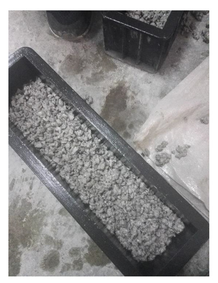 The activator was prepared by thoroughly mixing water glass, water, sodium hydroxide and retarder. A horizontal concrete mixer was used to prepare fresh concrete. During the preparation of pervious concrete, the coarse aggregate and slag were dry mixed at revolution speed of 62 ± 5 rpm and rotation speed of 140 ± 5 rpm for 1 min before the activator was added and mixed at revolution speed of 125 ± 10 rpm and rotation speed of 285 ± 10 rpm for another 2 min. Then, the pervious concrete was transferred into moulds sized 100 mm × 100 mm × 100 mm for compressive strength test and water permeability test, and 100 mm × 100 mm × 400 mm for tensile strength test, sealed with polyethylene film and stored in the laboratory at 20 ± 2 °C before being demoulded after 1 day of curing. The demoulded specimens were transferred to a curing room to be cured under standard curing conditions at a temperature of 20 ± 2 °C and relative humidity of more than 95% RH. The preparation of tensile strength test specimen was shown in Figure 4.