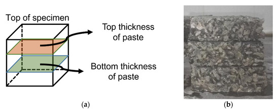 The thickness distribution of paste on the top and bottom of pervious concrete were analysed by horizontally cutting the pervious concrete at one-third and two-thirds of the height (Figure 7). Then, the thickness of paste on the coarse aggregate was measured by hand on the top and bottom cut surfaces. The methodology of measurement was the same as that reported by Torres [38]. Approximately 300 points were measured for each surface. The average thickness of each surface was calculated, and the thickness distribution was analysed.