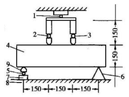 Setup of tensile strength test for standard-sized specimens, where 1 and 2 are single steel balls, 3 and 5 are double steel balls, 4 is the specimen, 6 is the unmovable support, 7 is the moving support, 8 is the bottom of equipment and 9 is the moving support.