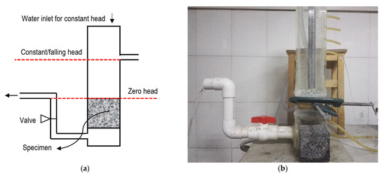(a) Diagram for the setup of water permeability test for pervious concrete under constant and falling water head, and (b) the real setup.
