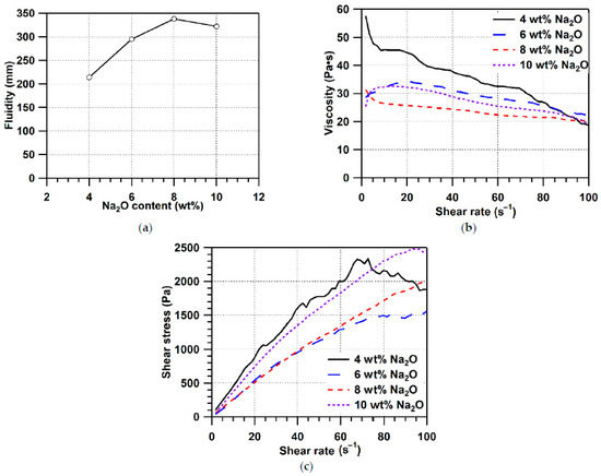 The relationship between the amount of water glass (as Na2O content) and (a) fluidity, (b) apparent viscosity and (c) shear stress of fresh paste.
