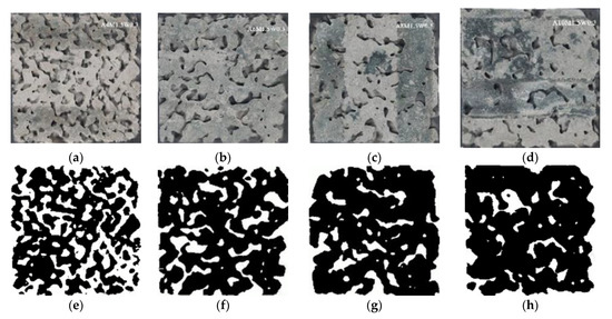 Optical (a–d) and respectively binary (e–h) images of the bottom of pervious concrete with different water glass content (as Na2O content). The side length of images is 100 mm. (a,e) 4 wt% Na2O; (b,f) 6 wt% Na2O; (c,g) 8 wt% Na2O; (d,h) 10 wt% Na2O.